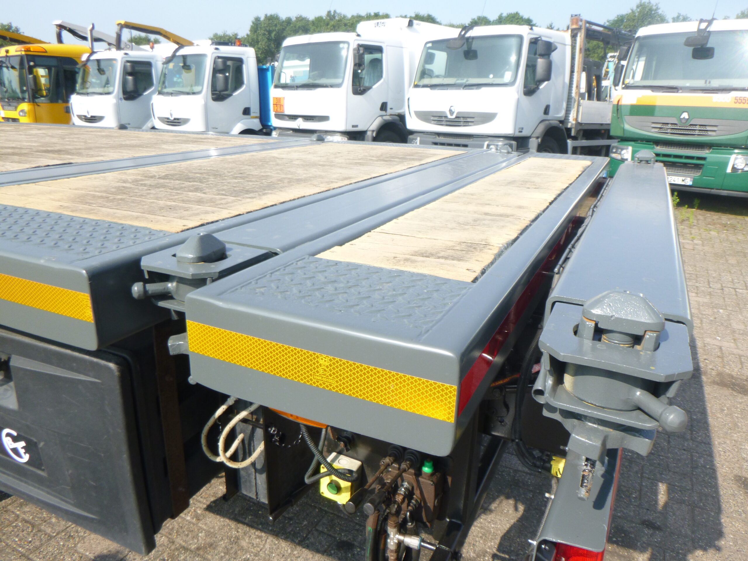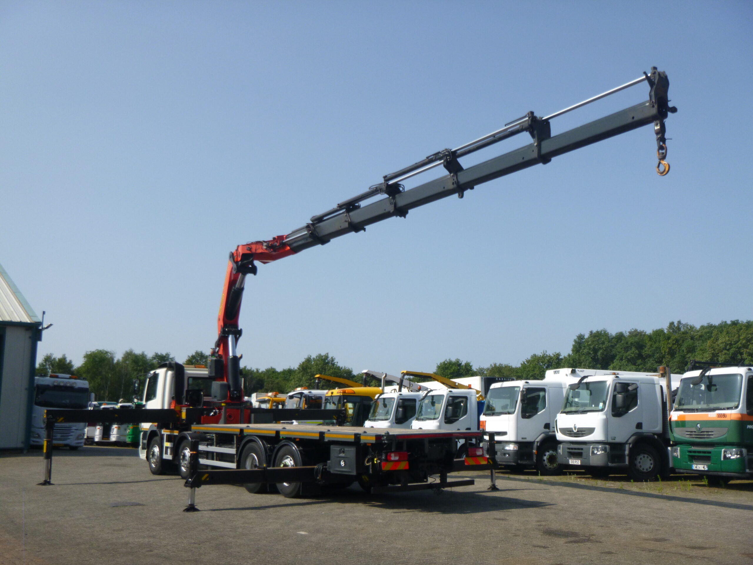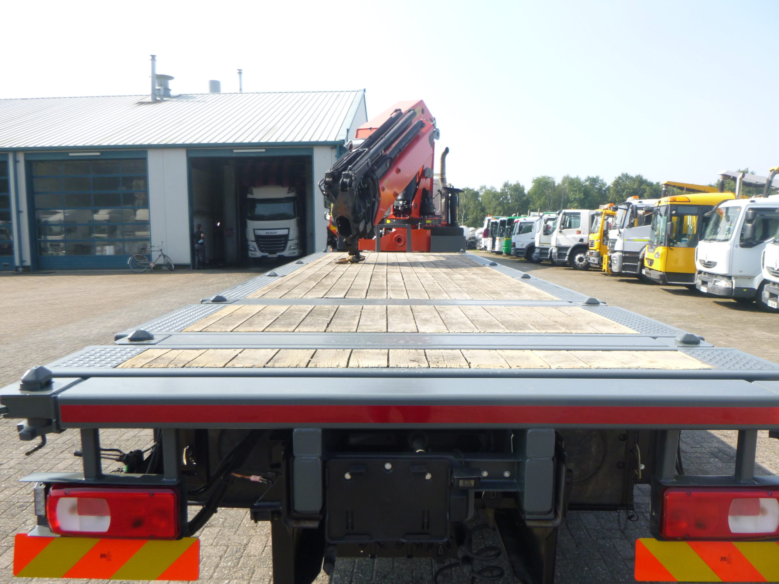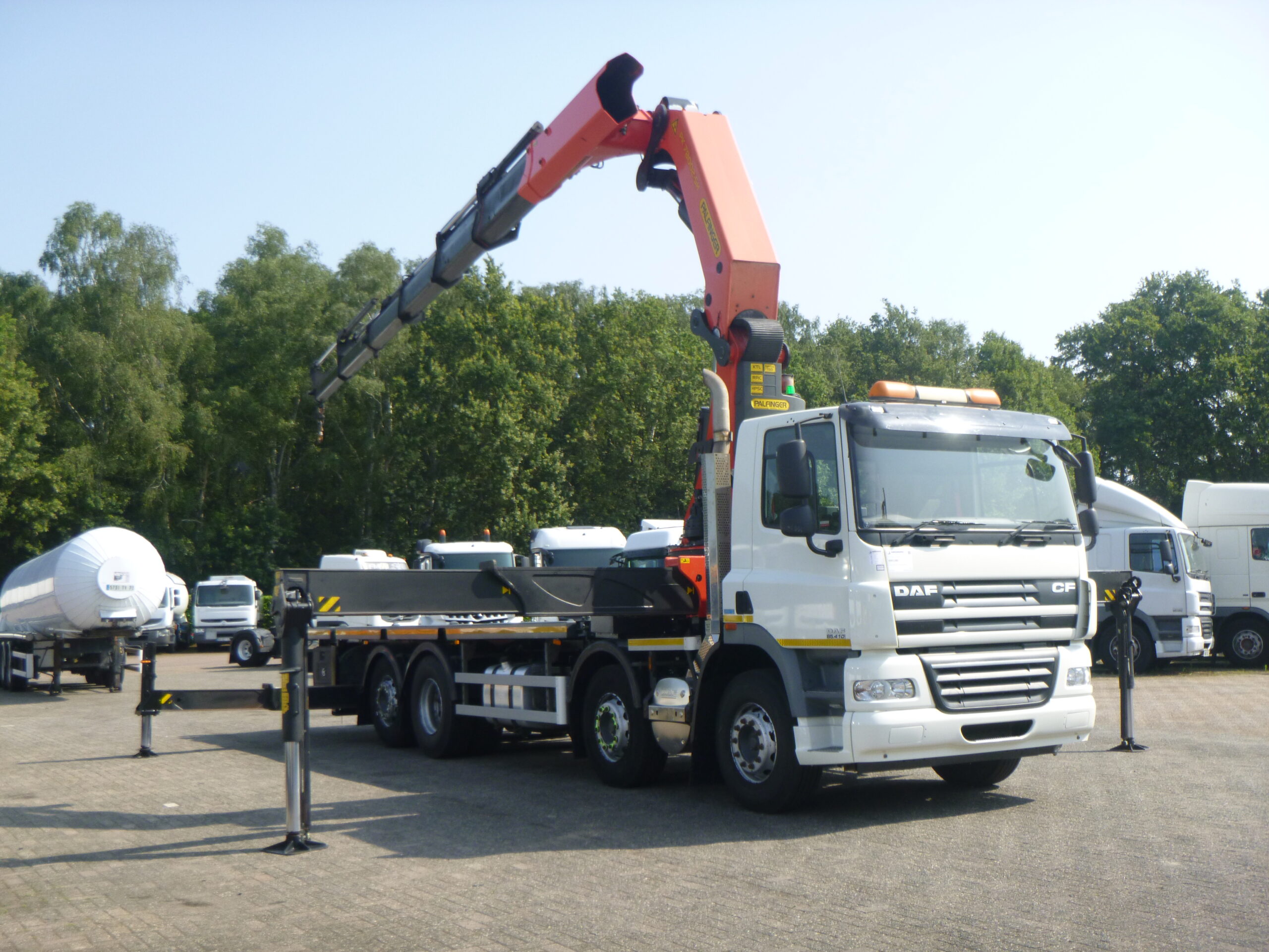 Palfinger PK78002-SE H Ladekran, 6 hydraulische Ausschübe, max. hydraulische Reichweite: 15,8 m horizontal / 20 m vertikal, max. Tragfähigkeiten: 16100 kg bei 4 m, 11400 kg bei 6 m, 8600 kg bei 7,8 m, 6700 kg bei 9,5 m, 5500 kg bei 11,8 m, 4550 kg bei 13,8 m, 3950 kg bei 15,8 m; 4 Stützbeine, Funkfernbedienung, Haken, Baujahr 2014 // Fosters ausziehbare Plattform, min. Abmessungen 805×255 cm, Bodenhöhe 140 cm, Twistlocks für 20-Fuß-Container // LKW RECHTSLENKER, Euro 5, AdBlue, 8×2, Stahlfederung vorne / Luftfederung hinten, Automatikgetriebe (2 Pedale), Diff. Schloss, Reifen 315/80R22,5, Rockinger-Anhängerkupplung, Tageskabine, digitaler Fahrtenschreiber, Versandabmessungen 1190x255x385 cm